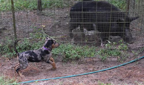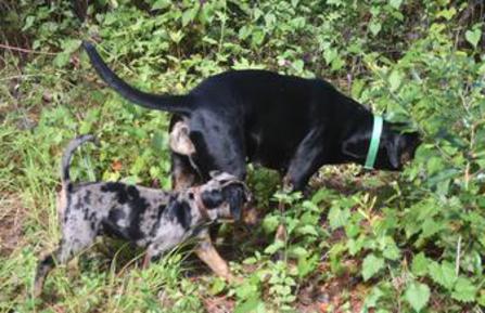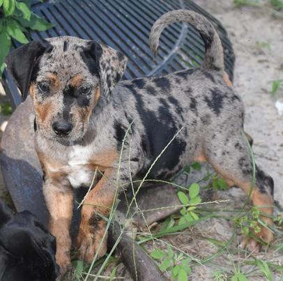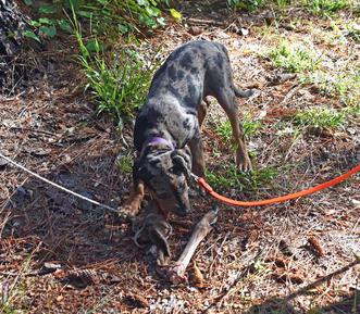 Rosie is a result of the long-awaited return of our foundation sire, Cracker Boy, to our line. Using frozen semen on an excellent wounded game tracking dog, Penney, we now have his daughter at Rocky Point and 11 siblings placed in working homes. She's smart and willful, her tracking training has started, and she's growing into being a versatile Catahoula.